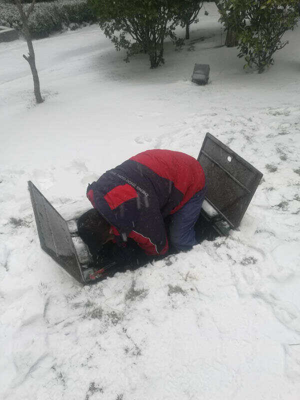 无独有偶,早上9点30分,位于农业路、嵩山路交口天汇广场1期院内,一表井漏水,郑州自来水投资控股有限公司营业处中原维修班维修人员贾维胜正在冒雪抢修。(大河网记者莫韶华)