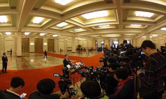 2018年3月8日,十三届全国人大一次会议在两会新闻中心举行记者会,这是记者在现场采访。(新华社记者张玉薇摄)