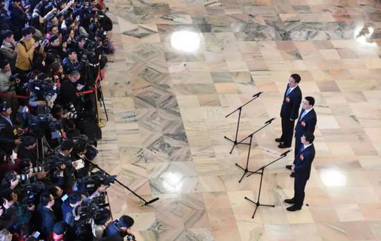 2018年3月15日,全国政协十三届一次会议在北京人民大会堂举行闭幕会。这是全国政协委员李彦宏、苏权科、邓中翰在“委员通道”接受采访。(新华社记者申宏摄)