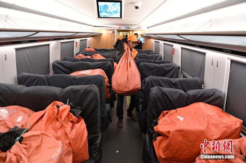 11月11日,西南铁路投入高铁载客动车组、确认列车等多种运力资源,联合中铁快运推出“高铁极速达”、冷链快递等多项运输服务,助力“双十一”电商黄金周运输需求。图为工作人员将成都发往南京的包裹装上列车。中新社记者 刘忠俊 摄