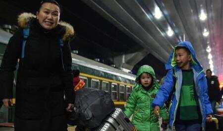 在铁路上海南站,返乡的旅客大包小包的等待着检票。 殷立勤摄