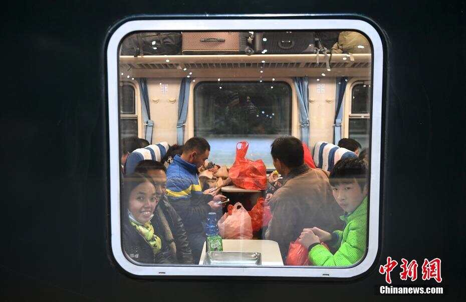 2月1日凌晨1时55分,共有1900多名旅客搭乘春运深圳首趟临客K4526次列车从深圳火车东站出发开往重庆。据悉,深圳站春运期间预计发送旅客251.3万人次。图为旅客坐上春运返乡列车。中新社记者 陈文 摄