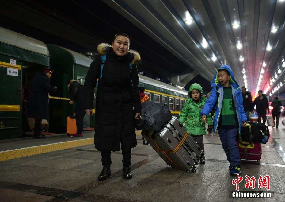 一位母亲带着两个孩子踏上回家路。 中新网记者 翟璐 摄