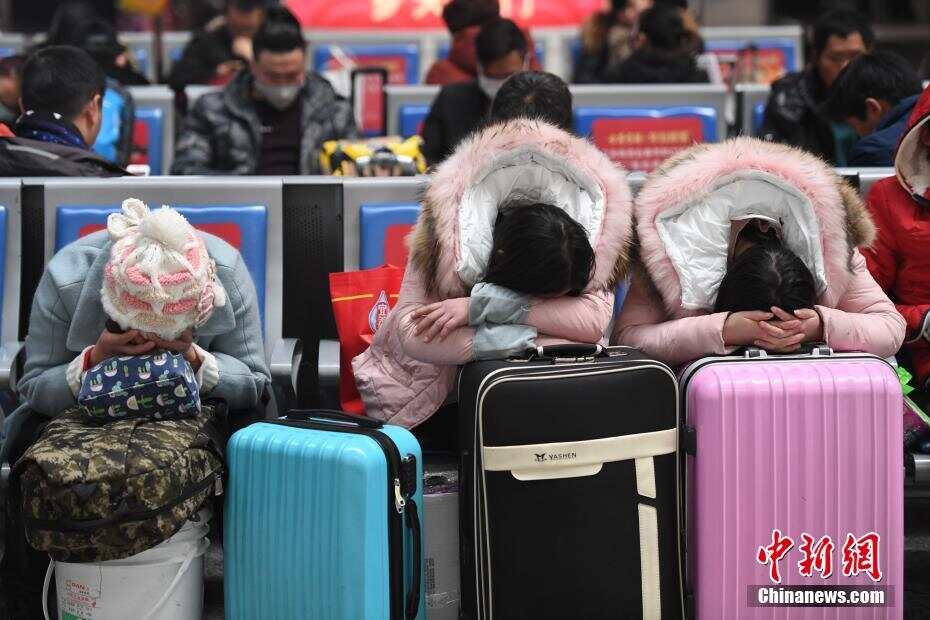 2月1日,三位旅客正趴在行李箱上休息。当日,为期40天的2018年春运正式启幕,浙江杭州铁路直属站(包括杭州东站)迎来大量出行客流。中新社记者王远 摄