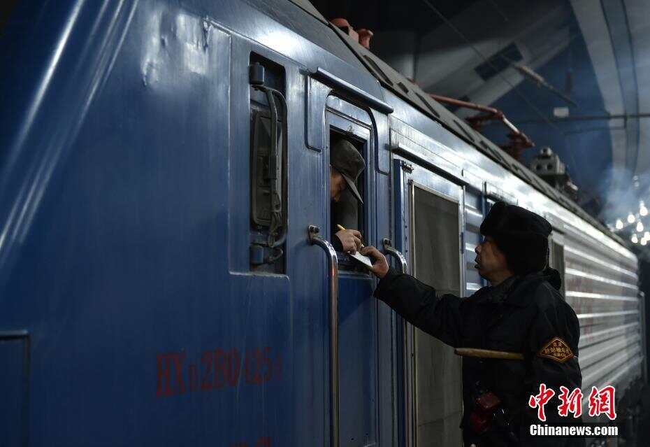 开车前,驻站检车员与车内人员进行最后的确认工作。 中新网记者翟璐 摄