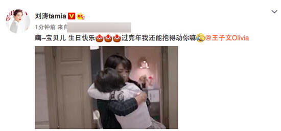 2月28日是王子文的生日,好姐妹刘涛也在零点发布了生日祝福微博:“嗨~宝贝儿 生日快乐,过完年我还能抱得动你嘛。”并配了一张自己一把抱起王子文的动图。网友见此纷纷评论:“涛姐这波操作很调皮了。”“女友力MAX,同求涛姐抱抱”。