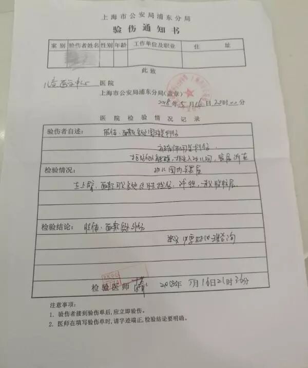 一位家长向记者表示,5月16日当晚,包括小草在内的4名孩子已在家长陪同下去儿童医学中心验伤,根据小草家长提供的上海市公安局浦东分局验伤通知书显示,他的检验结论为肢体、面颊多处外伤。