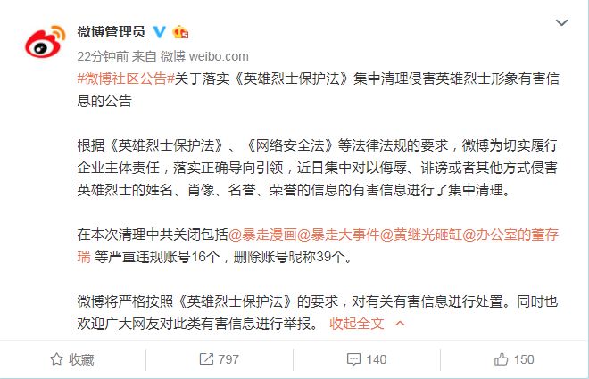 17日,因侵害英雄烈士形象,微博账号@暴走漫画、@暴走大事件、@黄继光砸缸等16个微博账号被关闭。