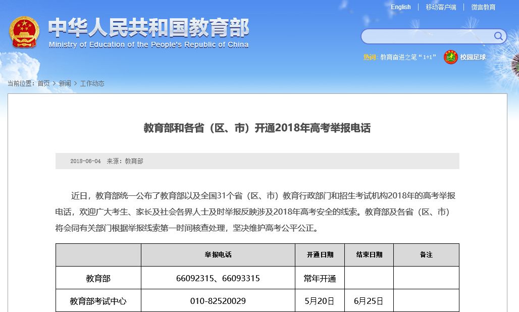 高考在即,教育部在官方网站公布了教育部以及全国31个省(区、市)教育行政部门和招生考试机构2018年的高考举报电话。