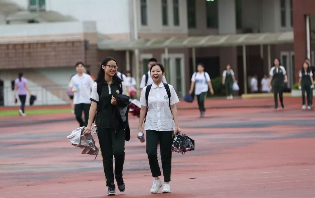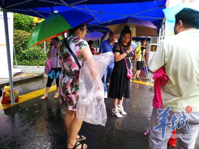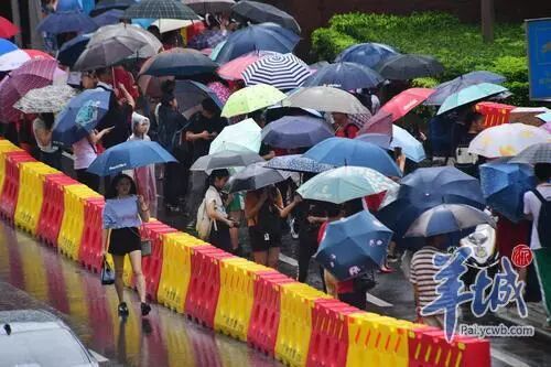 广州暴雨橙色预警下,学生和家长们从容有序地进入考场。