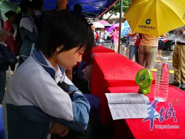 早上7:45,佛山市佛山二中考点门外的安保联勤服务点,有考生还在淡定复习。小风扇和纯净水真是备考的“黄金搭档”!