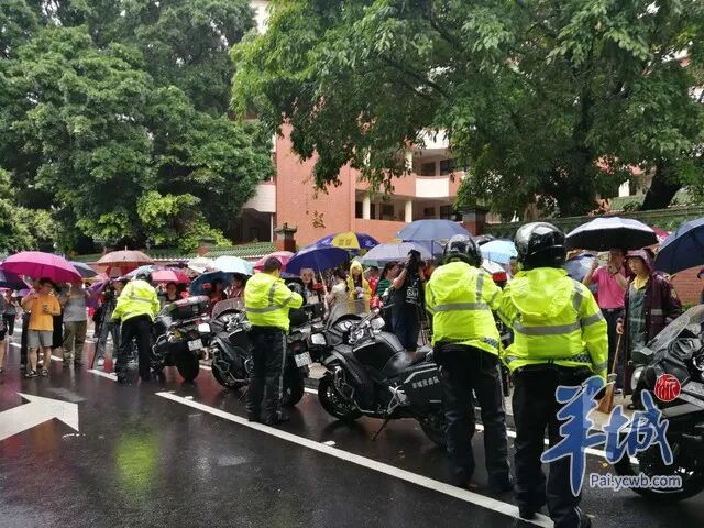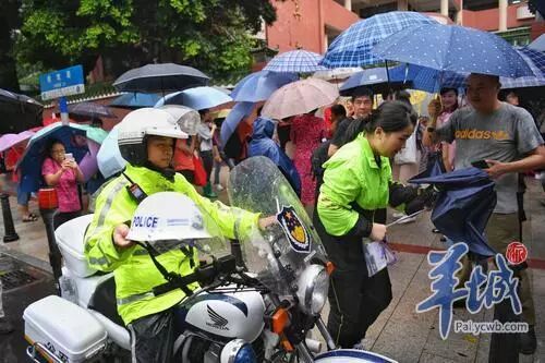 广州市第七中学考点,交警雨中送考。
