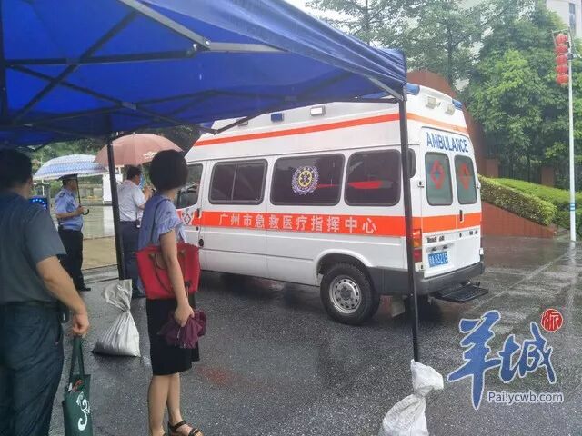 早上8:35,一辆救护车驶入广州市广附考场,据悉,这是番禺区政府派来考点的常驻救护车。考试两天,如果考生出现任何身体不适,救护人员可及时到场。