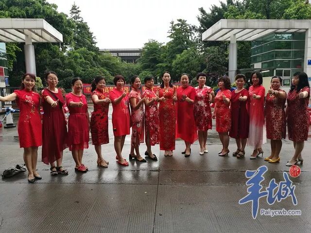 广州市执信中学考点,家长们相约穿了旗袍,预意旗开得剩,高喊:高昇班(高三11班班名)加油!执信必胜!