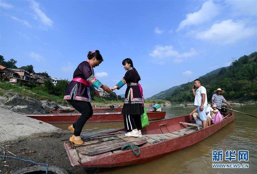 6月9日,在广西柳州市三江侗族自治县洋溪乡勇伟村,滚培衣(左一)和梁宏月(左二)搭乘渡船,前往三江县城参加展览活动。新华社发(黎寒池摄)