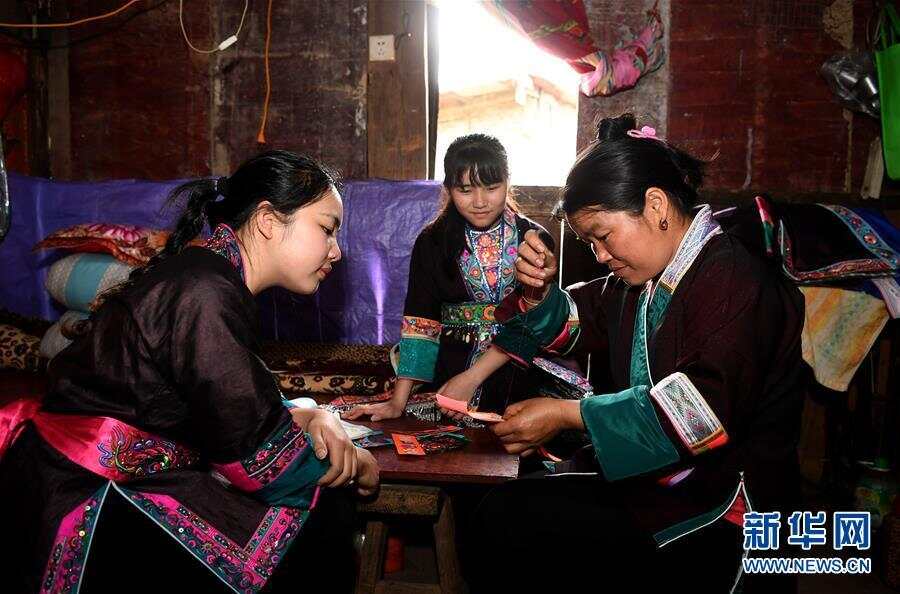 在广西柳州市三江侗族自治县洋溪乡勇伟村,滚培衣(右一)在家中制作刺绣作品(4月12日摄)。新华社发(黎寒池摄)