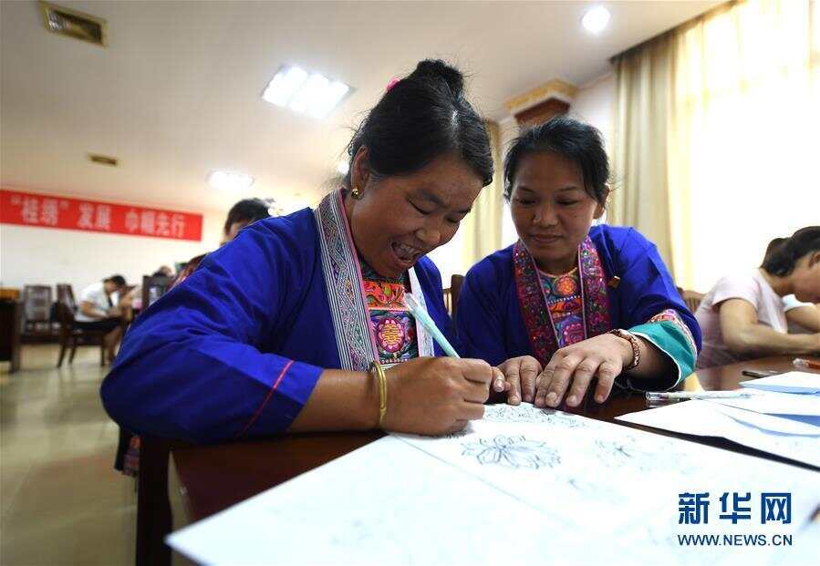 6月8日,在融水苗族自治县举办的柳州市贫困山区绣娘培训班上,滚培衣(左)在村干部潘翠玲的帮助下学习色彩搭配。新华社发(黎寒池摄)