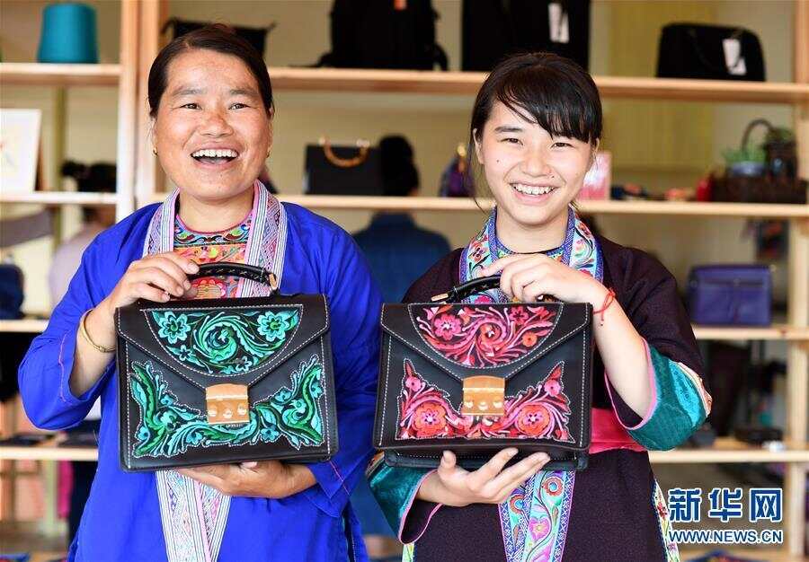 6月9日,在广西柳州市三江侗族自治县清花绣坊,滚培衣(左)和梁宏月展示由滚培衣刺绣作品制作而成的商品。新华社发(黎寒池摄)