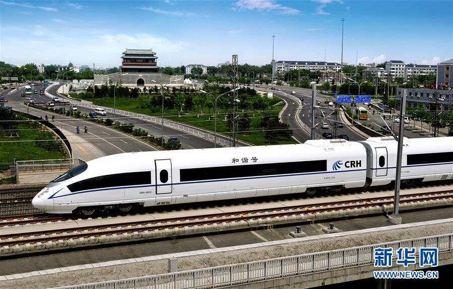 2008年5月30日,设计时速350公里高速铁路——京津城际铁路试验列车驶过北京永定门桥。新华社发 原瑞伦 摄 图片来源:新华网