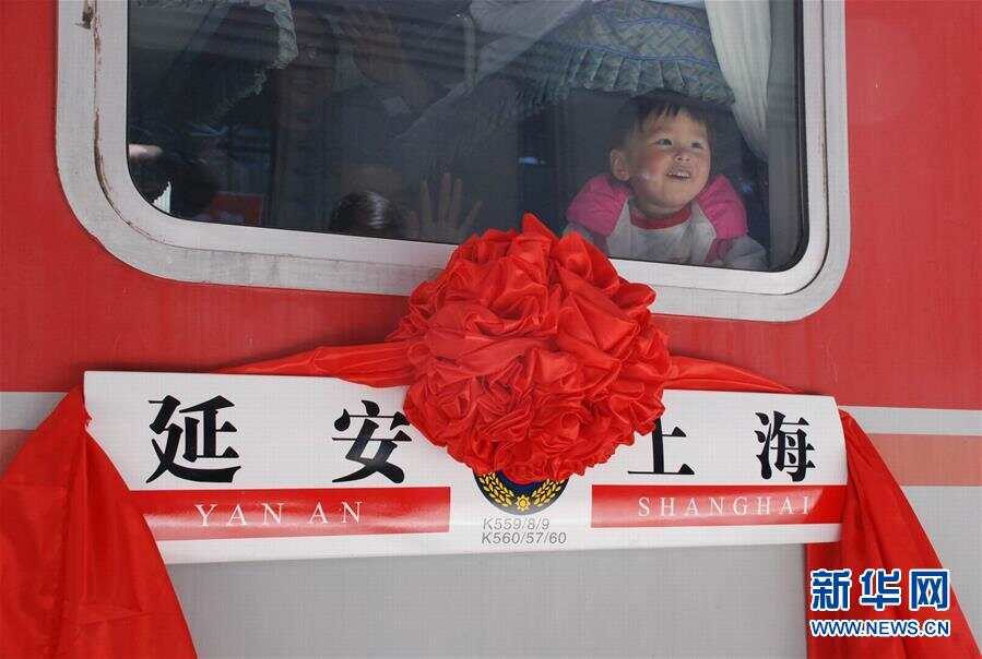 2007年4月18日,延安至上海K559/560次列车首发式在新落成的延安火车站举行,一位小女孩在延安开往上海的首趟列车上向窗外的亲戚打招呼。新华社发 祁小军 摄 图片来源:新华网