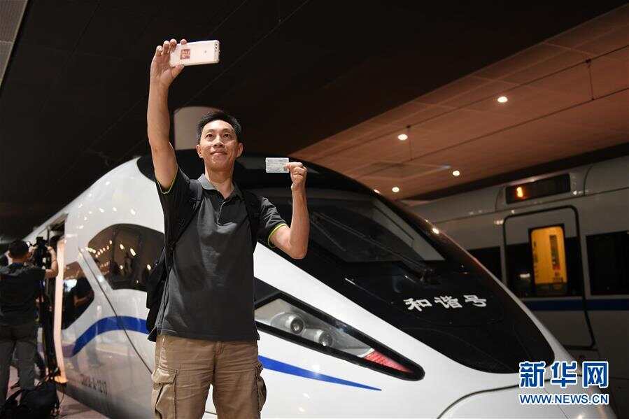 2018年9月23日,广深港高铁全线开通,搭乘G5711次高铁列车前往香港西九龙站的乘客在深圳北站拍照留念。新华社记者 毛思倩 摄 图片来源:新华网