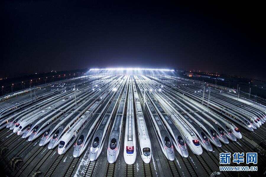 2018年2月1日凌晨,动车组停靠在武汉动车段的存车线上,准备进行检修和保温作业。近百组在武汉动车段经过检修、保温作业的动车组蓄势待发,迎接春运。新华社记者 肖艺九 摄 图片来源:新华网