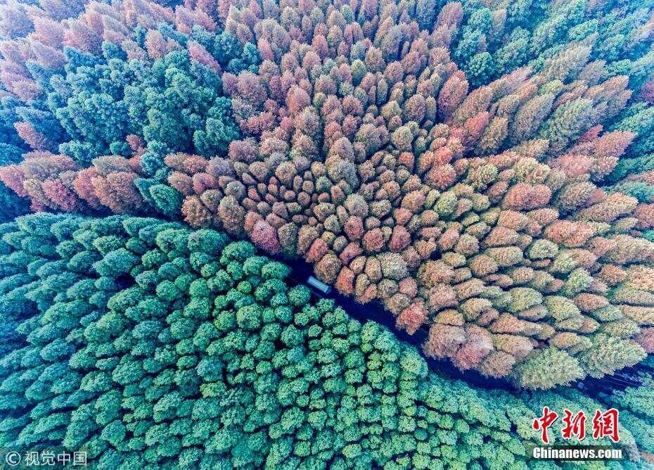 山王坪是我国首个喀斯特生态公园,园内栽种的上万亩水杉林和柳杉林,每到秋冬时节被一条公路分成两半,一边的水杉林由绿变黄,一边的柳杉则仍然保持着青绿色彩,形成双色林的奇特景观。图片来源:视觉中国