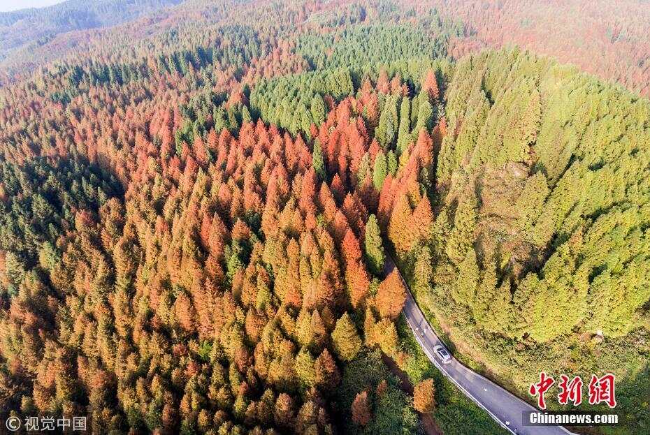 2018年10月30日,重庆市南川区山王坪喀斯特生态公园层林尽染,色彩迷人,形成一半是秋天,一半是春天的奇特景色,吸引了众多游客前来观赏。图片来源:视觉中国