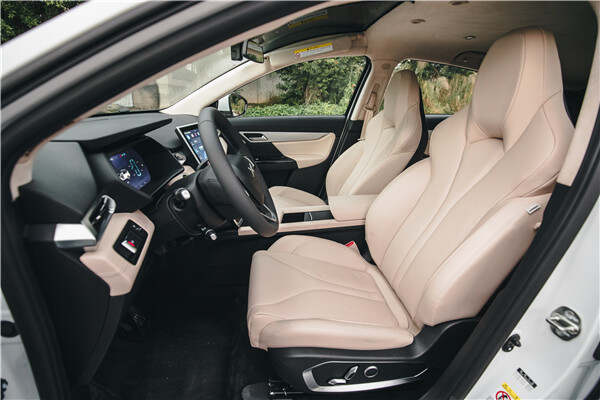 另外吸引眼球的地方就在于两块大屏,分别是装配在中控台的15.6英寸悬浮触控屏和12.3英寸高清全液晶仪智能仪表。两块屏幕采用了高清材质,视觉清晰,带有防炫目功能。悬浮触控屏偏向驾驶员,方面驾驶员操控。智能仪表能够显示车辆实时的数据,包括胎压、续航里程。另外,两块大屏实现部分数据互通,方便驾驶者随时观察,也提升了行车的安全。