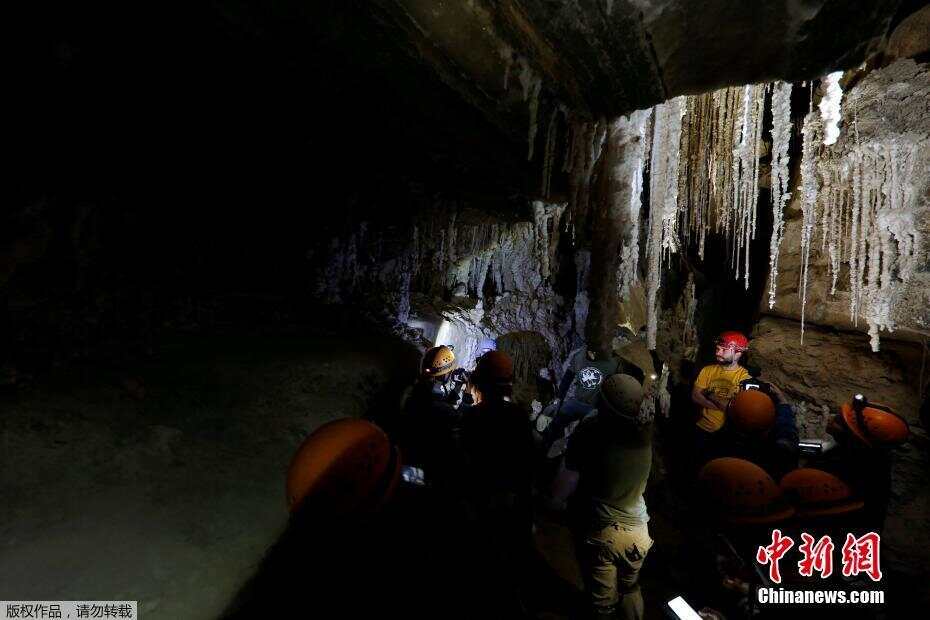 当地时间3月27日,以色列洞穴探险者俱乐部成员在死海西南部索多姆山(Mount Sodom)马勒姆盐洞(Malham salt cave)观察盐钟乳石。希伯来大学洞穴研究中心带领的来自九个不同国家的国际考察团已经绘制出10公里长的马勒姆盐洞内部图,该洞穴是在1980年代首次发现的,被誉为世界上最长的盐岩洞。