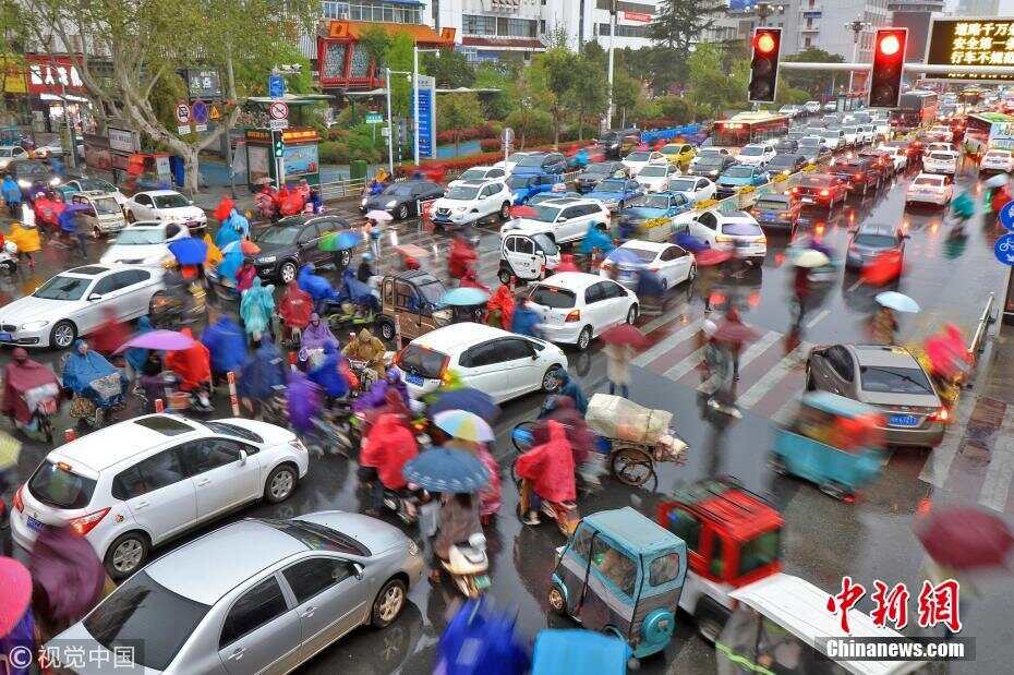 2019年4月9日,江苏省淮安市淮海北路,行人和汽车在暴雨中缓慢通过路口。一夜大风过后,淮安市区迎来降温降雨天气,气温较上日直降12摄氏度,并出现短时大风暴雨的恶劣天气。 图片来源:视觉中国