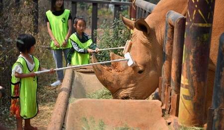 4月28日,小饲养员给犀牛挠痒。当日,在“五一”国际劳动节来临之际,4名小朋友受邀来到云南野生动物园,在饲养员的带领指导下劳动,体验犀牛、长颈鹿饲养员的工作。中新社记者 刘冉阳 摄