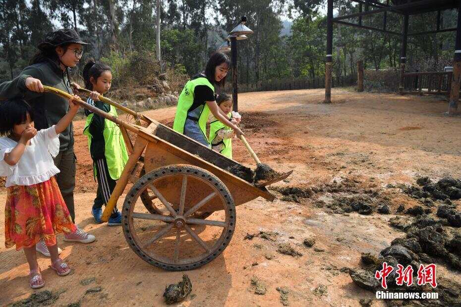4月28日,4名小饲养员清理犀牛粪便。当日,在“五一”国际劳动节来临之际,4名小朋友受邀来到云南野生动物园,在饲养员的带领指导下劳动,体验犀牛、长颈鹿饲养员的工作。中新社记者 刘冉阳 摄