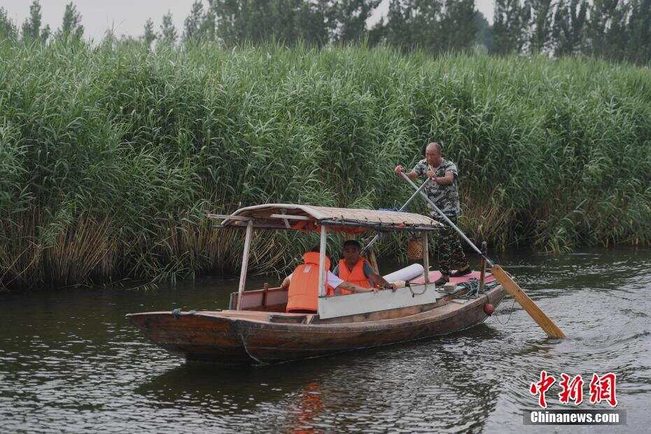 6月26日,两位游客乘船游览白洋淀。7月1日起,河北省保定市制定出台的《保定市白洋淀上游生态环境保护条例》将实施,在白洋淀上游生态系统保护上建立长效机制,助力雄安新区生态建设。 中新社记者 王刚 摄
