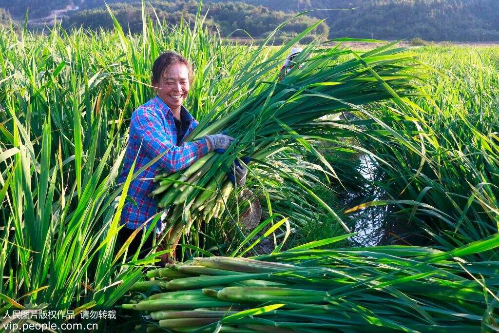 2019年10月22日,江西乐安县招携镇高望村农民正在采收茭白。为进一步巩固脱贫攻坚成果,江西乐安县通过“合作社+基地+农户”模式,引进浙江双季茭白种植280多亩。曾文才 黄煜/摄