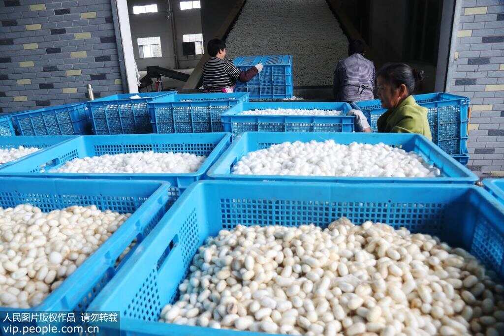10月22日,在重庆市黔江区双河丝绸厂,工人在烘烤刚从蚕农手中收购来的秋蚕茧。重庆市黔江区将蚕桑作为农民增收的扶贫产业来发展。目前,该区有桑园面积15万多亩,蚕户1.7万余户,成为重庆第一大蚕桑种植基地。今年,该区饲养桑蚕7.6万张,产鲜蚕茧6万担。杨敏/摄