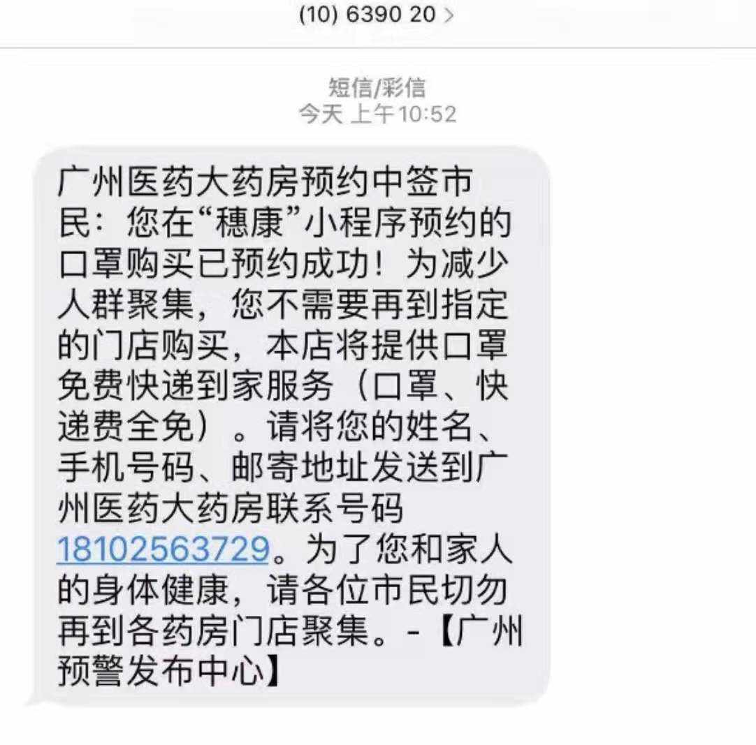 1月31日晚,广州“穗康”小程序口罩预约功能上线,市民踊跃预约。今早,已有部分市民前往指定药店领取口罩。记者从广药集团获悉,昨晚成功预约购买口罩的广州市民,不需现场购买!将免费送到家!
