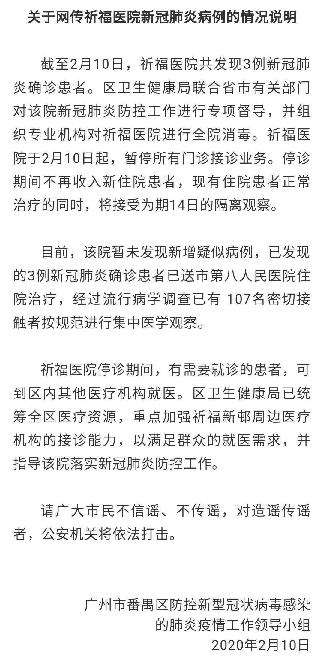 据微信公众号“广州番禺发布”消息,2月10日晚,广州市番禺区防控新型冠状病毒感染的肺炎疫情工作领导小组发布关于网传祈福医院新冠肺炎病例的情况说明。