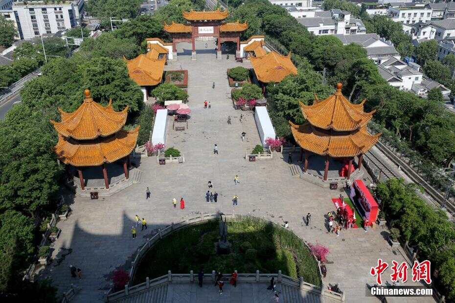游客在黄鹤楼景区游园赏春。中新社记者 张畅 摄