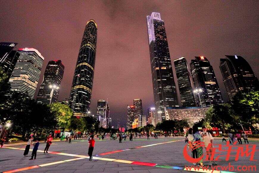 9月30日晚19时30分,广州塔塔身灯网发布庆祝国庆的祝福标语,花城广场也张灯结彩,广场两边高楼纷纷亮灯,吸引众多市民驻足拍照。 羊城晚报全媒体记者 周巍 摄