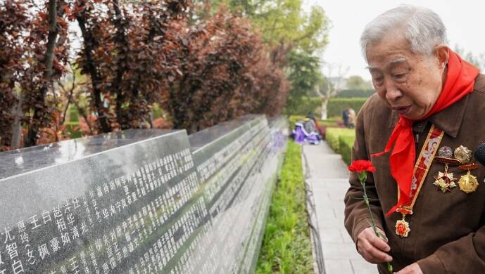 新华社上海4月2日电(记者吴振东潘旭郭敬丹)“我想和你们说,现在我们国家强大了,我的晚年生活也很幸福,但是生活越是幸福,我就越是想念你们啊!”91岁的新四军老战士刘天同,眼中含泪,默念着纪念墙上一个个故去战友的姓名。随后,他慢慢弯下腰,把一枝花放在了石碑前。