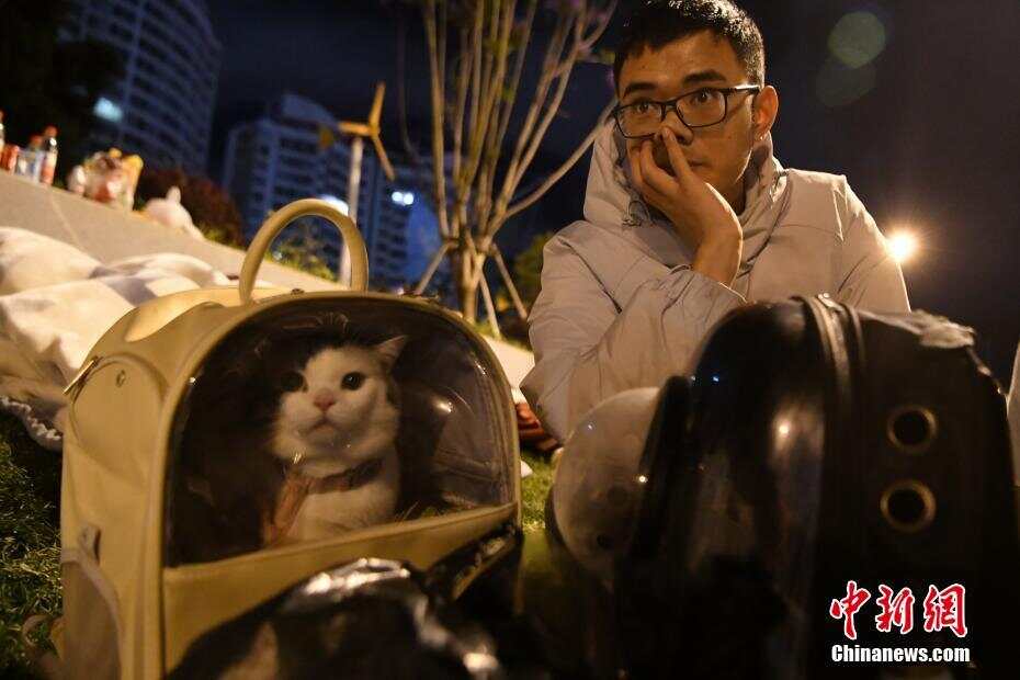 5月22日凌晨,受云南省大理州漾濞县地震影响,大理市不少市民在户外过夜。图为市民张先生和爱宠在户外度过一夜。 中新社记者 刘冉阳 摄