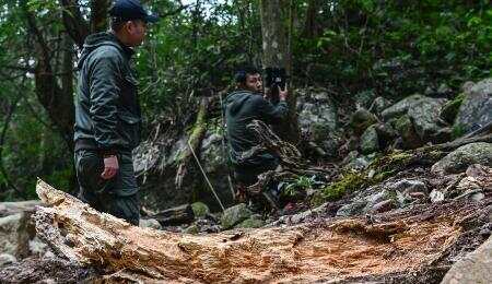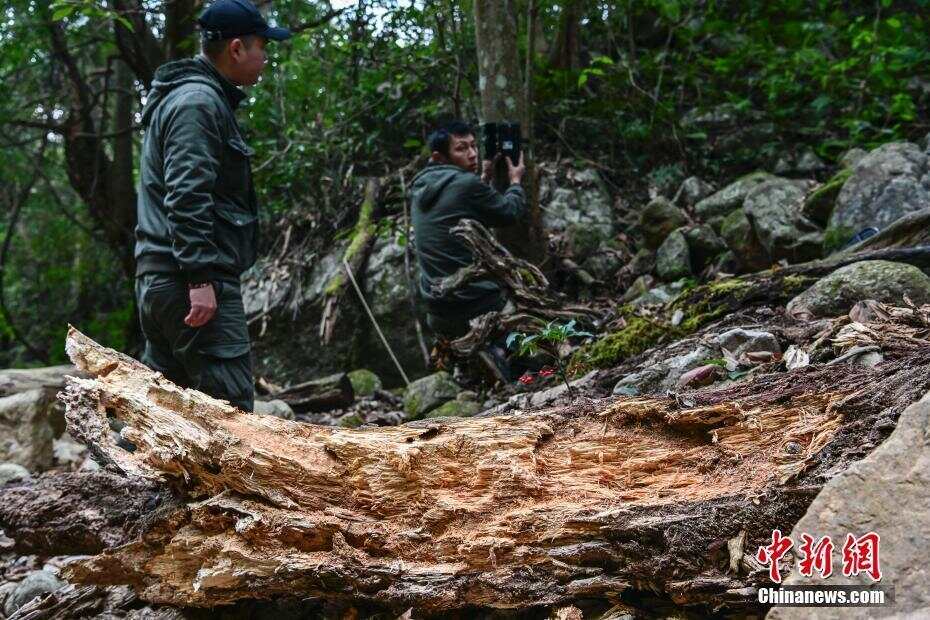 1月14日,广东省韶关市,广东南岭国家级自然保护区林业技术员周智鹏(右)与工作人员张崇万在保护区内发现野生动物啃咬过的树木,随后在该树木旁安装红外相机用于监测。该保护区森林覆盖率达98%以上,是粤港澳大湾区重要的生态安全屏障,也是广东省生物资源最丰富的自然保护区和最大的生物物种基因库。 中新社记者 陈骥旻 摄