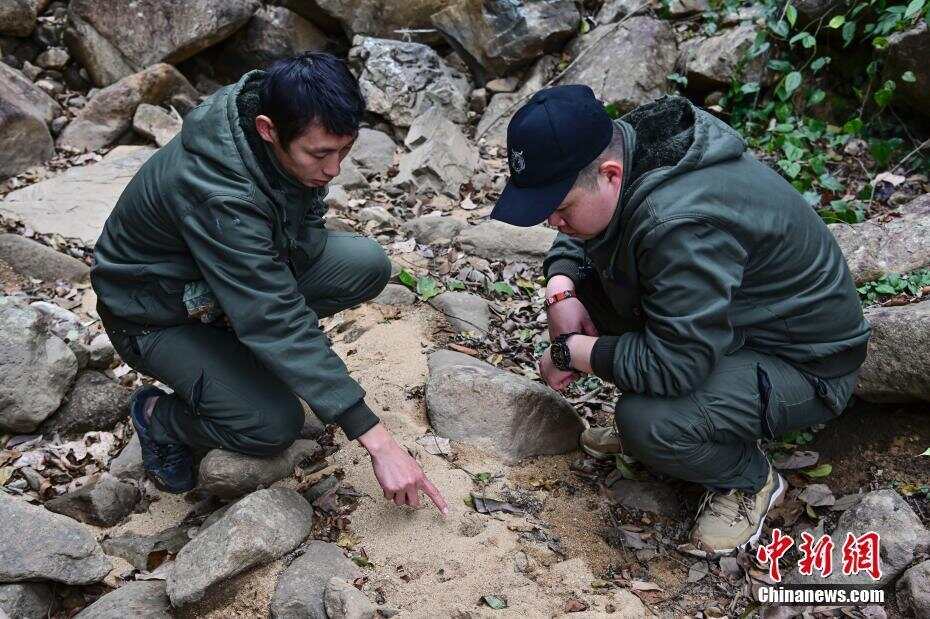 1月14日,广东省韶关市,广东南岭国家级自然保护区林业技术员周智鹏(左)与工作人员张崇万在保护区内发现野生动物足迹。 中新社记者 陈骥旻 摄