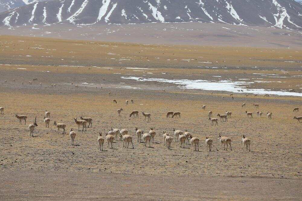 雪山和藏羚羊群组成了特殊的高原风景。边巴摄