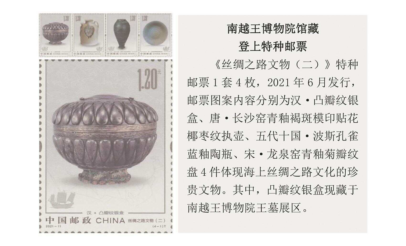 其中,广东省博物馆(广州鲁迅纪念馆)围绕《红色热土 不朽丰碑》等展览设计出系列主题文创产品,百花图系列产品更入选“全国百佳文化创意产品”,“从伦勃朗到莫奈”数字文创获评“十三五”全国博物馆文创精品。该馆还结合当下智慧零售的发展方向,推出博物馆智慧文创商店,上线天猫旗舰店,走出博物馆文创产品生产销售的新路径。广东民间工艺博物馆的陈家祠积木、深圳博物馆的“馆藏”系列文创产品同样获评“全国百佳文化创意产品”。南越王博物院馆藏珍贵文物凸瓣纹银盒作为图案登上《丝绸之路文物(二)》特种邮票(见上图)。