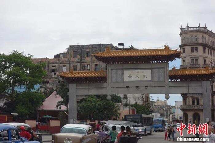 2015年4月拍摄的古巴哈瓦那旧城区桑哈拉约街口处的“华人街”牌坊。中新社记者 莫成雄 摄