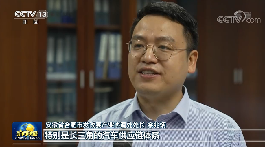 安徽省合肥市发改委产业协调处处长 余兆炳:特别是长三角的汽车供应链体系,比如汽车内外饰很多来自上海、浙江,汽车电子器件很多来自江苏。正是因为产业一体化合作成效显著,大大降低了我们的生产成本,也吸引了一批汽车行业龙头落户合肥。