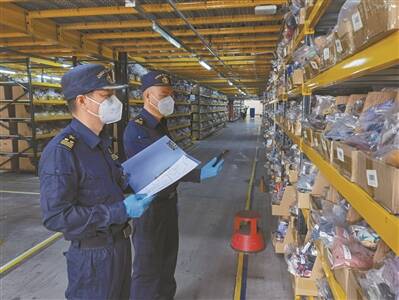 广州海关所属南沙海关关员在跨境电商仓库开展巡仓监管。