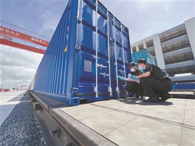 广州海关所属南沙海关关员对中欧班列集装箱进行监管。